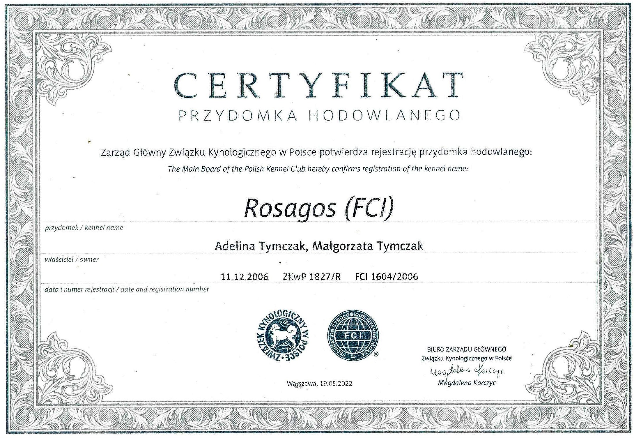 Hodowla Rosagos została zarejestrowana w FCI w 2006 roku (certyfikat przydomka hodowlanego).